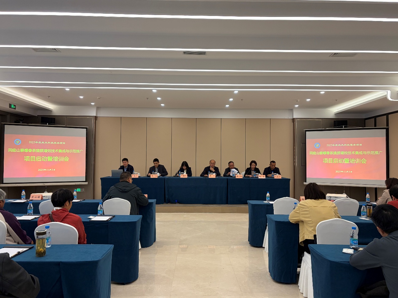 11月3日,由太湖所牽頭的亞夫科技服務項目“洞庭山碧螺春茶提質增效技術集成與示范推廣”啟動會暨培訓會在東山鎮順利舉行。我院成果轉化處處長顧軍、蘇州市園藝站站長于明華、吳中區農業農村局副局長楊青出席會議。會議特邀安徽農業大學茶樹種質創新與資源利用全國重點實驗室劉升銳教授參與項目指導并開展專題培訓。東山鎮、金庭鎮等相關領導,茶企茶農代表、農技骨干及項目組成員共80余人參加會議。會議由太湖所副所長董明輝主持。