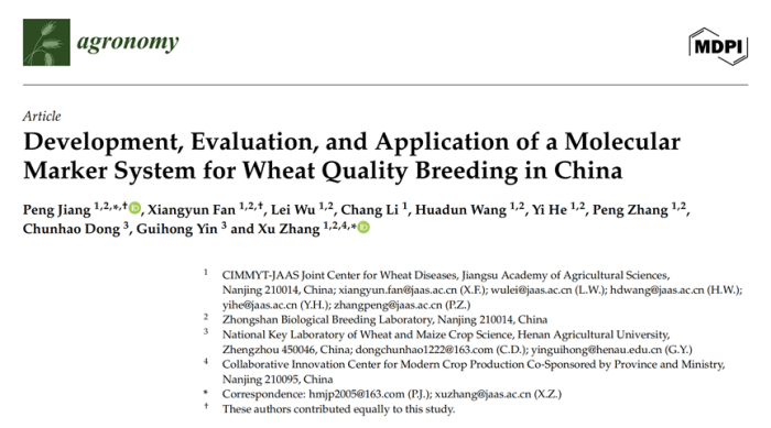 近日,糧作所小麥遺傳育種團隊在國際期刊《Agronomy》發表了關于小麥品質分子標記選擇體系(Quality Molecular Marker Selection System,QMMS)的研究成果(DOI: 10.3390/agronomy15112494)。團隊通過整合前期籽粒蛋白質含量、籽粒硬度、高分子量麥谷蛋白亞基等核心品質性狀相關研究結果,成功構建小麥QMMS,以約 5 元 / 樣本的低成本、高通量優勢,破解傳統品質育種盲目低效的難題,為我國專用小麥精準培育提供關鍵技術支撐。該研究得到河南農業大學、揚州大學、江蘇里下河地區農業科學研究所、江蘇省鎮江市農業科學院、江蘇瑞華農業科技有限公司等單位的大力支持。