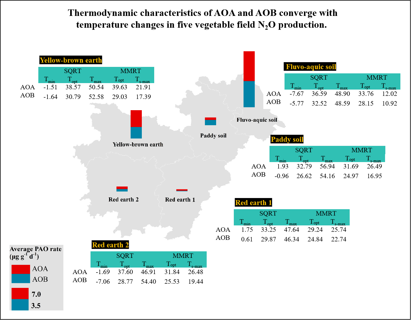 近日,淮陰所土肥中心研究團隊在長江中下游流域溫室蔬菜土壤氨氧化古菌和細菌的熱力學參數對溫度變化的響應方面取得重要進展。該成果以“Thermodynamic response of ammonia-oxidizing archaea and bacteria in vegetable soils across Yangtze River Basin”為題,成功發表在環境土壤學領域知名期刊《Applied Soil Ecology》(JCR二區,IF=5.0)期刊上。該項成果為我院與南京農業大學合作共同發表,淮陰所董玉兵博士為第一作者。研究表明,AOA比AOB更偏愛高溫,且對溫度變化更為敏感,這意味著在全球氣候變暖的背景下,由AOA主導的N2O排放可能會加劇,為長江中下游地區農業溫室氣體精準減排提供了新的科學依據。